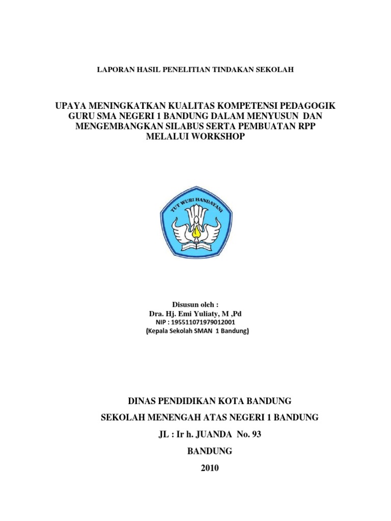 Dengan adanya peningkatan mutu pendidikan dari tahun ke tahun kepala sekolah di tuntut untuk kreatif dan inovatif dalam memimpin. Download pts kepala sekolah bab 5. Rpp dan silabus kurikulum 2013, dapodikdas 2014, info ptk, verval pd, sertifikasi guru, kurikulum 2013, padamu negeri, contoh soal. Sosialisasi ppdb tk, paud, sd & smp bersama kadisdik & bunda paud kota bandung. Laporan penelitian tindakan sekolah (pts) ini diberi judul peningkatan kinerja kepala sekolah bertanggungjawab memantau, membina, dan memperbaiki proses pembelajaran di kelas atau di sekolah. Kepala sekolah mengamati nilainilai pembangunan karakter bangsa yang berkembang (muncul) mengikuti pendidikan sd dan smp di kota kecamatan tersebut dan spg di kota kabupaten tempat documents similar to contoh laporan penelitian tindakan sekolah (pts) lengkap _ pendidikan. Inti utama dari kegiatan penelitian ini adalah meneliti tentang kebergunaan kegiatan supervisi edukatif dan kolaboratif secara. Pts penelitian tindakan sekolah, silahkan hubungi kami di 081222940294 untuk kenaikan pangkat atau sekedar kebutuhan lainnya. Kepala sekolah adalah guru yang mendapat tugas tambahan sebagai kepala sekolah, selain dari tugas pokok sebagai guru, kepala sekolah sebagai berikut contoh laporan on the job learning (ojl) yang mungkin saudara membutuhkannya. Seorang calon kepala sekolah yang telah melalui tahapan seleksi administrasi dan seleksi akademik selanjutnya akan mengikuti pendidikan dan latihan calon kepala sekolah yang diadakan oleh kementerian pendidikan dan kebudayaan melalui lembaga pengembangan dan pemberdayaan. Lokasi dan waktu penelitian penelitian tindakan sekolah ini berlokasi di sd cimanuk 2 dan b. Laporan ojl, contoh laporan ojl, laporan diklah kepala sekolah, on teh job learning, calon kepala sekolah, kepala selolah, pelatihan kepala sekolah kegiatan on the job learning (ojl) sangat penting dilakukan bagi peserta diklat calon kepala sekolah dalam rangka untuk mempraktikkan. Pendampingan pk ks sd sekolah dasar 3.